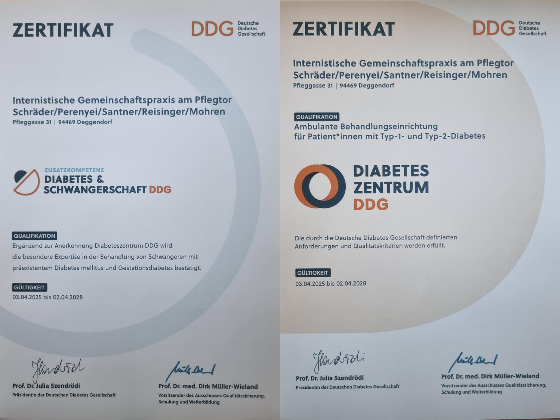Wir sind erneut von der Deutschen Diabetes Gesellschaft DDG zertifiziert worden als offizielles Diabeteszentrum für die ambulante Behandlung von Patient*innen mit Typ-1- und Typ-2-Diabetes und erstmals ergänzend dazu auch explizit für die besondere Behandlung von Frauen mit Schwangerschaftsdiabetes.